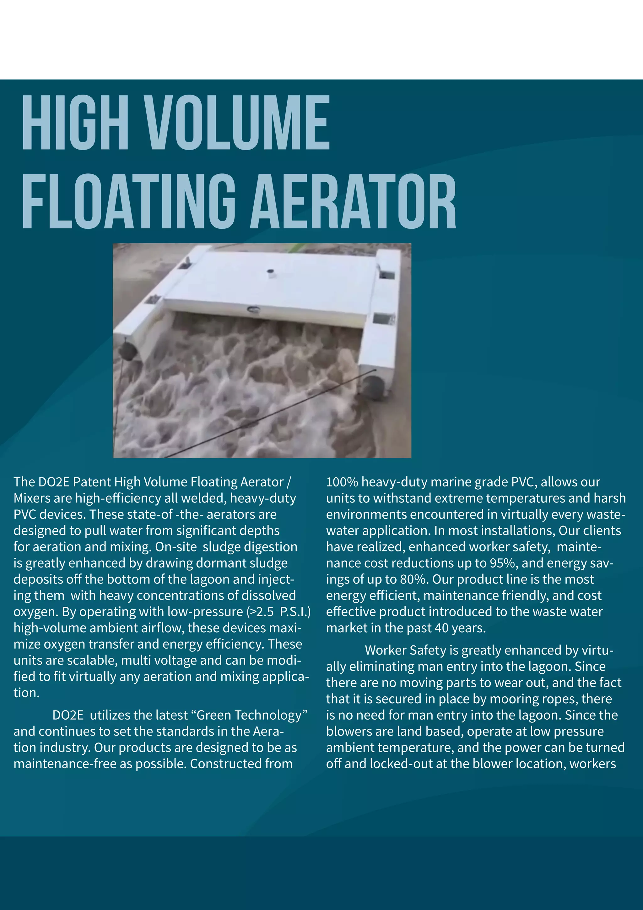 This document describes a high volume floating aerator and mixer produced by DO2E Wastewater Treatment. The aerator is designed to enhance on-site sludge digestion by drawing dormant sludge deposits into the water column and injecting them with dissolved oxygen. It operates using low-pressure, high-volume airflow to maximize oxygen transfer and energy efficiency while aerating and mixing large volumes of water. The aerator is constructed from durable PVC materials and designed for maintenance-free operation, enhanced worker safety, and reduced energy and maintenance costs compared to other aeration equipment.