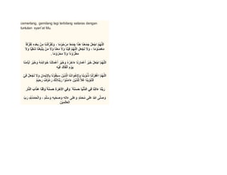 Doa ini dimulai dengan memuji Allah SWT dan mengucapkan salam kepada Nabi Muhammad SAW. Doa ini memohon berkah dan kebaikan dari Allah SWT untuk pertemuan majlis rasmi ini agar terhindar dari kemungkaran. Doa ini juga memohon kekuatan ikatan persaudaraan dan perpaduan antara para hadirin, serta memohon kebaikan dan hidayah untuk para hadirin dan anak cucu mereka. Di akhir doa ini memohon ampunan dosa dan memohon kebaikan di