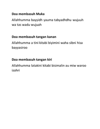 This document contains 3 Islamic prayers for washing different parts of the body. The first prayer is for washing the face and asks Allah to purify faces on the day they are whitened. The second prayer is for washing the right hand and asks Allah to give a good record in the right hand and forgive sins. The third prayer is for washing the left hand and asks Allah to not make the record held in the left hand exposed for those who see or to travel far.