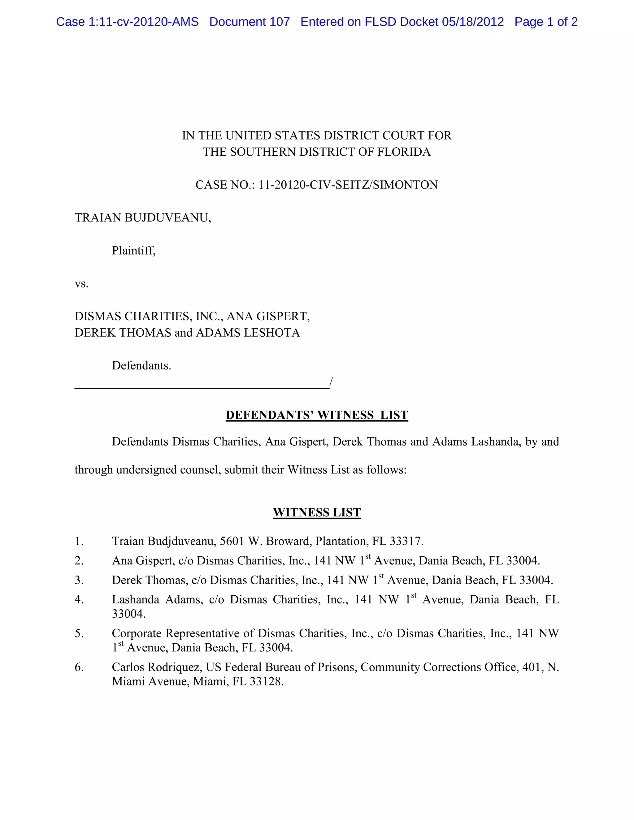This document is a witness list filed by the defendants, Dismas Charities, Inc., Ana Gispert, Derek Thomas, and Adams Lashanda, in a case filed by plaintiff Traian Bujduveanu in the United States District Court for the Southern District of Florida. The witness list includes the plaintiff, the individual defendants, a corporate representative of Dismas Charities, and other potential witnesses from related government agencies. The defendants reserve the right to amend the witness list as discovery in the case continues.