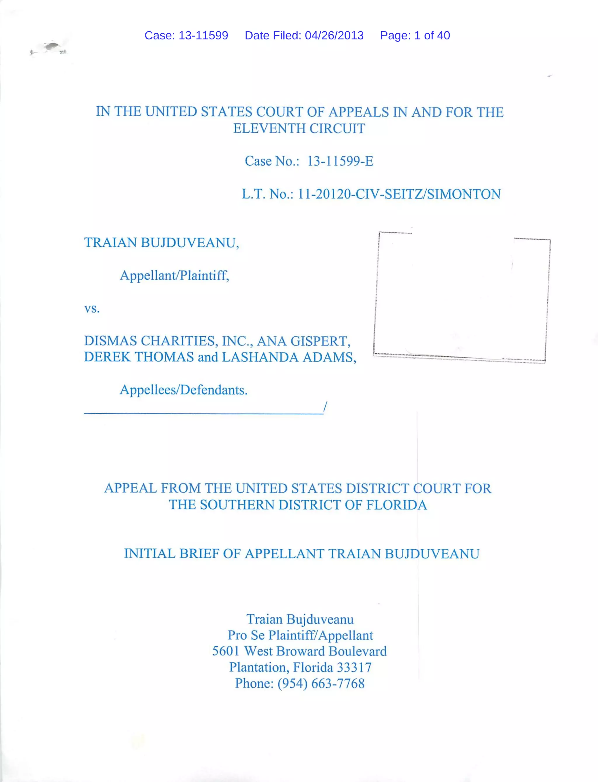 This document is an initial brief filed by Traian Bujduveanu in the United States Court of Appeals for the Eleventh Circuit appealing a lower court decision. It provides background on the case, which involves claims by Bujduveanu against Dismas Charities Inc. and several employees for violations of his civil rights during his residency at a halfway house operated by Dismas. It outlines the procedural history of the case in the lower court and provides statements of facts and the case intended to support Bujduveanu's appeal.