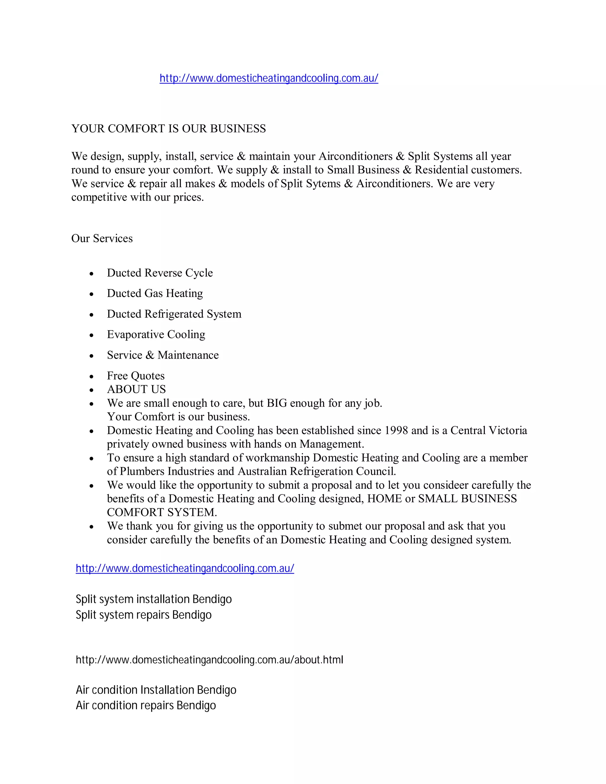 Domestic Heating and Cooling offers design, supply, installation, service, and maintenance of air conditioners and split systems for residential and small business customers since 1998. They provide various services including ducted heating and cooling, evaporative cooling, and free quotes, ensuring competitive pricing and high workmanship standards as members of relevant industry councils. The company emphasizes their commitment to customer comfort and tailored solutions.