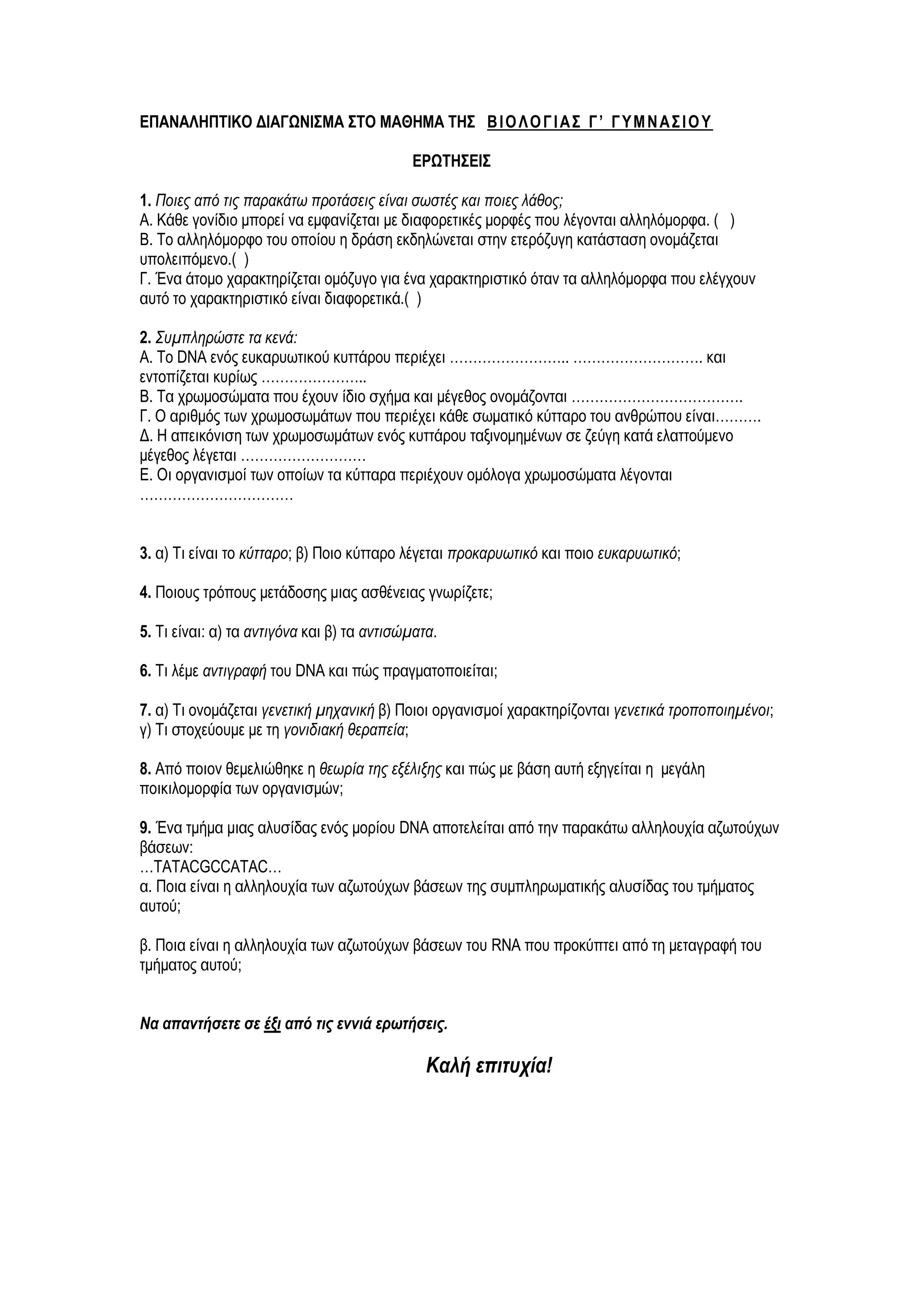 ΕΠΑΝΑΛΗΠΤΙΚΟ ΔΙΑΓΩΝΙΣΜΑ ΣΤΟΜΑΘΗΜΑ ΤΗΣ ΒΙΟΛΟΓΙΑΣ Γ’ ΓΥΜΝΑΣΙΟΥ
