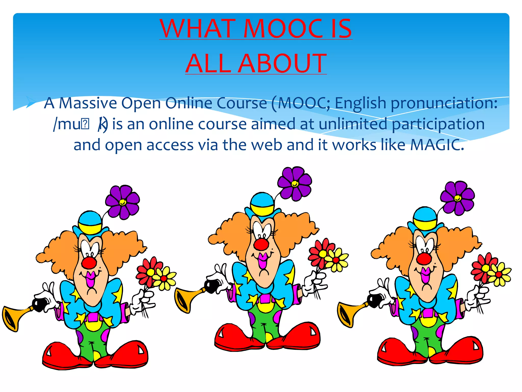 A Massive Open Online Course (MOOC) is an online course that allows unlimited participation and open access via the web. The first MOOCs emerged from the open educational resources movement in 2008. There are two main types of MOOCs - cMOOCs which focus on connectivist and constructivist approaches, and xMOOCs which are more formal and behaviorist. MOOCs allow anyone with an internet connection to participate in online learning regardless of age, ability, or location. However, they also face some criticisms like low completion rates and requirements of self-regulation from participants.