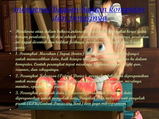 Dokumen tersebut menjelaskan bagian-bagian utama komputer dan fungsinya, termasuk hardware seperti CPU, RAM, harddisk, kartu grafis, dan periferal seperti keyboard, mouse, printer. Juga disebutkan software penting seperti sistem operasi dan program aplikasi serta driver perangkat keras.