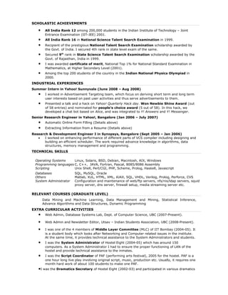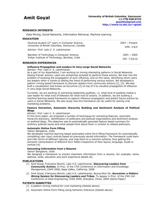 This document is Amit Goyal's resume. It summarizes his education, research interests and experiences. He is currently a PhD student studying data mining, social networks and machine learning at the University of British Columbia. His research focuses on influence propagation and identifying leaders in social networks. He has worked as a research engineer at Yahoo! and Synopsys, developing tools for automatic online form filling and extracting information from resumes.