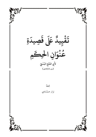 رب ﷲ اﳊﻤﺪﺳﻴﺪﻧﺎ ﻋﲆ واﻟﺴﻼم اﻟﺼﻼةوﻣﻮﻻﻧﺎﳏﻤﺪاﻷﻧﺒﻴﺎء أﴍف ،اﳌﺮﺳﻠﲔ وﺳﻴﺪوﻋﲆوﺻﺤﺒﻪ آﻟﻪ،أﲨﻌﲔ اﻟﻄﺎﻫﺮﻳﻦ اﻟﻄﻴﺒﲔوﺳﻠﻢﻳﻮم إﱃ ﻛﺜﲑا ﺗﺴﻠﻴﲈً اﻟﺪﻳﻦ. وﺑﻌﺪ،ﺗﻘﻴﻴﺪ ﻓﻬﺬاٌﲨﻌﺘﻪﺑﻌﺪي ﻣﻦ اﷲ ﺷﺎء وﻣﻦ ﻧﻔﴘ ﻧﻔﻊ رﺟﺎءﻋﲆﻗﺼﻴﺪة اﻷدﻳﺐاﻟﺒ اﻟﻔﺘﺢ أﰊُاﻟﻔﻀﻞ ﰲ ﻋﴫه أوﺣﺪ ،ﻧﺤﺮﻳﺮ ﻛﺎﺗﺐ ،اﻟﺸﻌﺮ ﺳﺎﺋﺮ ﺷﺎﻋﺮ وﻫﻮ ،ﺴﺘﻲ واﳌﺮوءة واﻷﻓﻀﺎلﻃ واﻟﻨﻈﻢ اﻟﻨﺜﺮ ﰲ ﺑﻼﻏﺘﻪ ﻃﺒﻘﺖ ،ﺒ،اﻵﻓﺎق ﰲ ذﻛﺮه وذاع ،اﻷرض ﻖ ﺷﻌﺮ وﺳﺎرُاﻟﺒﻼد ﰲ ه،ﻓﻤﻦﺣﻜﻤﻪِ َِﻗﻮﻟﻪ اﻟﺒﺪﻳﻌﺔ:»ﻣَﻦْأَﺻْﻠَﺢَﻓَﺎﺳِﺪَهُأَرْﻏَﻢَﺣَﺎﺳِﺪَهُ«وﻗﻮﻟﻪ ،: »ﻣَﻦْأَﻃَﺎعَﻏَﻀَﺒَﻪُأَﺿَﺎعَأَدَﺑَﻪُ«وﻗﻮﻟﻪ ،:»ﻋَﺎدَاتُاﻟﺴﱠﺎدَاتِﺳَﺎدَاتُاﻟﻌَﺎدَاتِ«وﻗﻮﻟﻪ ،:»ﻣِﻦْ ﺳَﻌَﺎدَةِﺟَﺪﱢكَوُﻗُﻮﻓُﻚَﻋِْﻨﺪَﺣَﺪﱢكَ«وﻗﻮﻟﻪ ،:»أَﺟْﻬَﻞُﱠﻨاﻟﺎسِﻣَﻦْﻛَﺎنَﻟِﻺِﺧْﻮَانِﻣُﺬِﻻوَﻋَﲆَ اﻟﺴﱡﻠْﻄَﺎنِﻣُﺪِﻻ«وﻗﻮﻟﻪ ،:»ﺣَﺪﱡاﻟﻌَﻔَﺎفِ:اﻟﺮﱢﺿَﺑ ﺎِﺎﻟﻜَﻔَﺎفِ«.ﺑﻌﻨﻮان اﳌﺴﲈة اﻟﻘﺼﻴﺪة أﻣﺎّ ﺑﻘﻮﻟﻪ اﻓﺘﺘﺤﻬﺎ ﻓﻘﺪ ،اﳊﻜﻢ: 1ـزِﻳـــَﺎدَةُاﻟــــﻤَﺮْﰲ ءِ ِدﻧْ ُﻴـــَﺎهُﻧﻘـــْ ُﺼَﺎنٌوَرﺑﺤـــﻪُ ُ ْ ِﻏـــَﲑَ ْاﳋـــ ﳏـــﺾَ ِ ْ َﲑِ ْﺧـــﴪانُ ْ ُ اﻟﺰﻳﺎدة:اﻟﻨﻤﻮﱡ. واﻟـﻤَﺤْﺾُ:اﳋَﺎﻟِﺺُﻏﲑه َﺎﻟﻄﻪﳜ ﻟـﻢ اﻟﺬيُ ُُ ْ َْ ْ ِ ُِ َ ﱠ. واﻟـﻤَﻌْﻨِﻲﱡ:زِﻳَﺎدَةُﻛُﻞﱢاﻣْﺮِئٍﰲِدُﻧْﻴَﺎهُﻋِﺰّاًوَﻣَﺎﻻًوﺟﺎهً َ َﻳُﻔْﻀِﻴَﺎنِإِﱃَاﻟﺸﱠﻘَﺎوَةِوَﻳُﻮرِﺛَﺎنِ ﱠﻨاﻟﺪَاﻣَﺔَﻫُﻮَﰲِاﳊَﻘِﻴﻘَﺔِﻧُﻘْﺼَﺎنٌو ،َﻣَﺎرﺑﺤﺎ ﲣﻴﻠﻪً ْ ُ ﱠِ ُ َ َﻓَﻬُﻮَﺧﴪان اﻟﺘﺤﻘﻴﻖ ْﺪﻨﻋٌ َ ْ ُ ِ ِ ِ ْ ﱠ َإ ،ِﻻﱠإِذَﻛ اَﺎنَﻣﺎَ