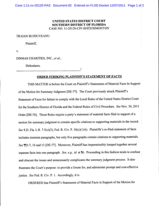 This order strikes Plaintiff's statement of material facts in support of their motion for summary judgment. The court found that Plaintiff's statement failed to comply with the Local Rules of the United States District Court for the Southern District of Florida and the Federal Rules of Civil Procedure. Specifically, the statement contained more than one assertion of fact per numbered paragraph and did not contain citations to the record to support the assertions made. If Plaintiff re-files their statement of facts, it must comply with the Federal and Local Rules by containing only one assertion of fact per numbered paragraph and including citations to support each assertion. Failure to do so will result in the court striking the re-filed statement and motion for summary judgment.