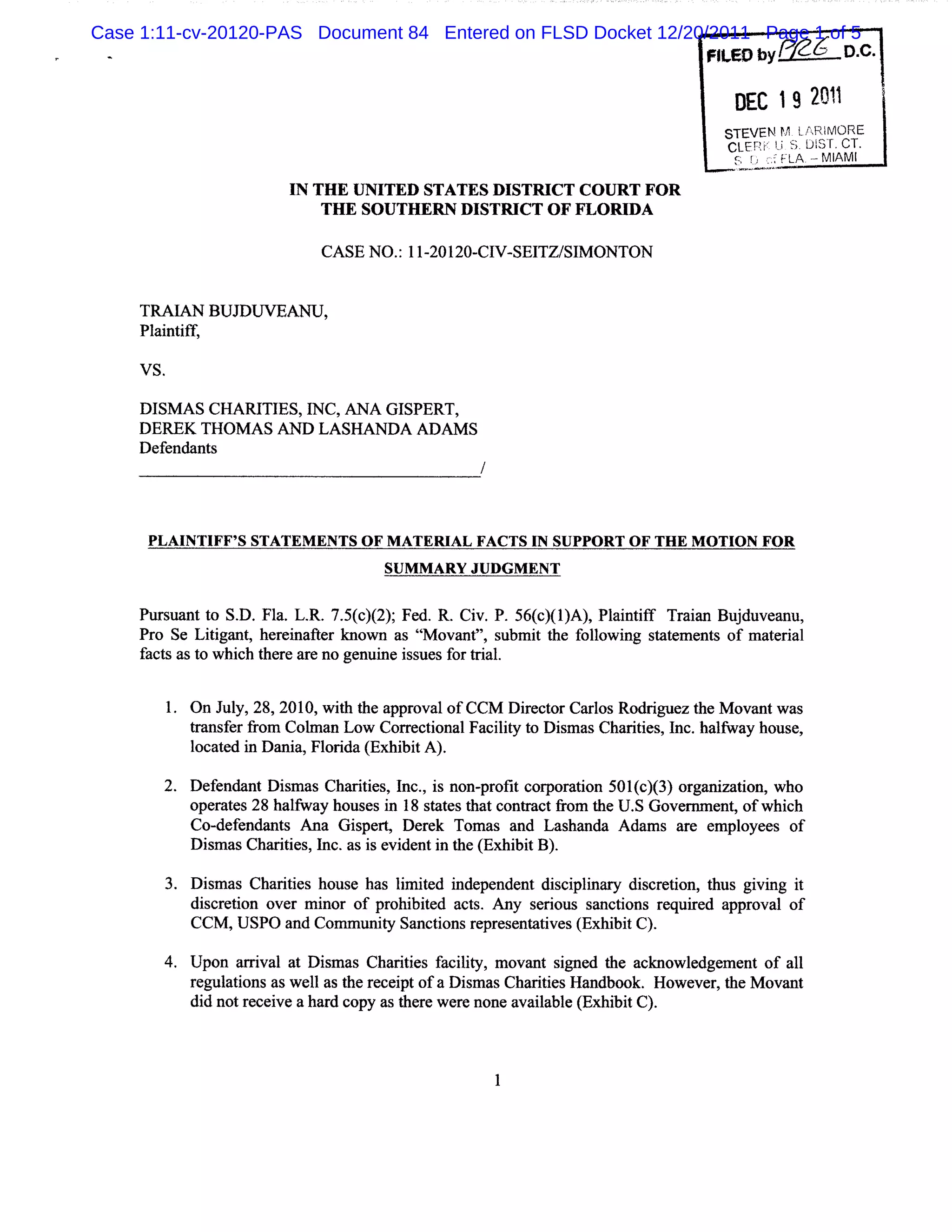 1. The plaintiff, Traian Bujduveanu, filed a motion for summary judgment in a civil case against Dimas Charteris House and employees Derek Thomas, Lashanda Adams, and Ana Gipert.