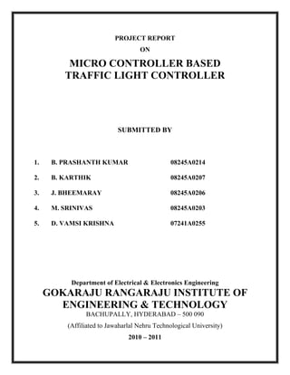 This document is a project report on a microcontroller based traffic light controller. It describes the development of a traffic light controller that uses a microcontroller and LEDs to automatically control traffic lights on a centralized basis. The microcontroller is programmed to adjust the timing and phasing of the traffic signals to meet changing traffic conditions. The circuit uses basic electronic components like an LED for the traffic lights and a microcontroller for automatic signal changing after a preset time interval. It aims to provide a reliable and cost-effective traffic light control solution.