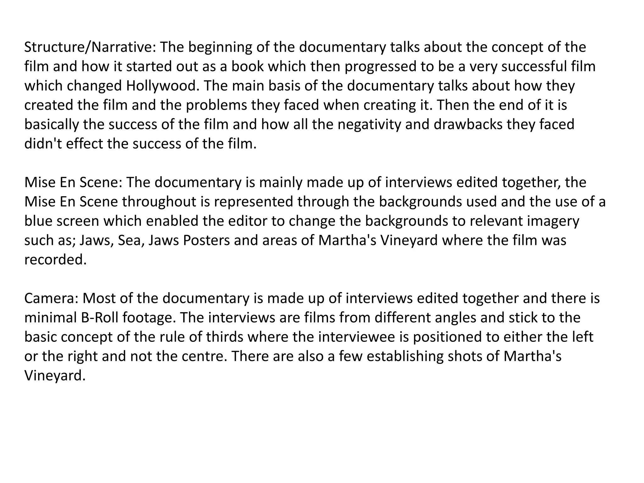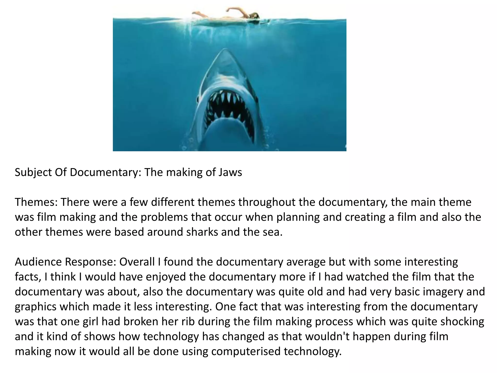 The documentary summarizes the making of the film Jaws, focusing on the challenges faced during production. Interviews with the cast and crew discuss how the film started as a novel and became a blockbuster, changing Hollywood. Problems included technical issues creating the mechanical shark prop and an actress breaking a rib during filming. Despite difficulties, the documentary shows how the film was ultimately a massive success despite initial doubts during production.