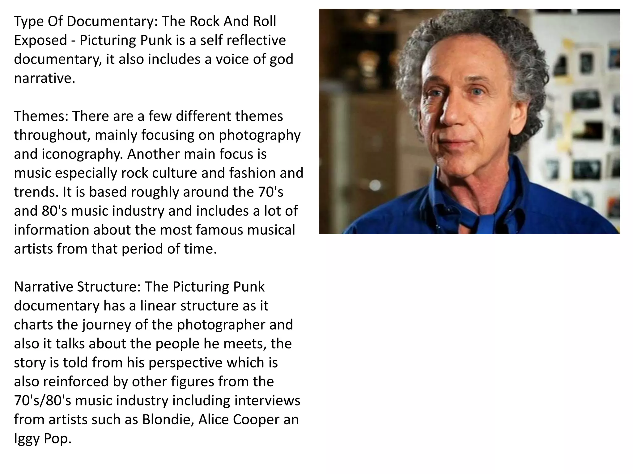The documentary "Picturing Punk" focuses on photographer Bob Gruen and charts his journey through the 1970s-1980s music scene. It includes interviews with artists like Blondie and Iggy Pop about the themes of photography, rock music, and fashion during that era. The documentary has a linear narrative structure told from Gruen's perspective. It utilizes archive photos and footage as well as talking head interviews with a shallow depth of field. The mise-en-scene considers the clothing and lighting used during the interviews to represent the personalities of the artists. Non-diegetic music plays in the background to accompany the dialogue.