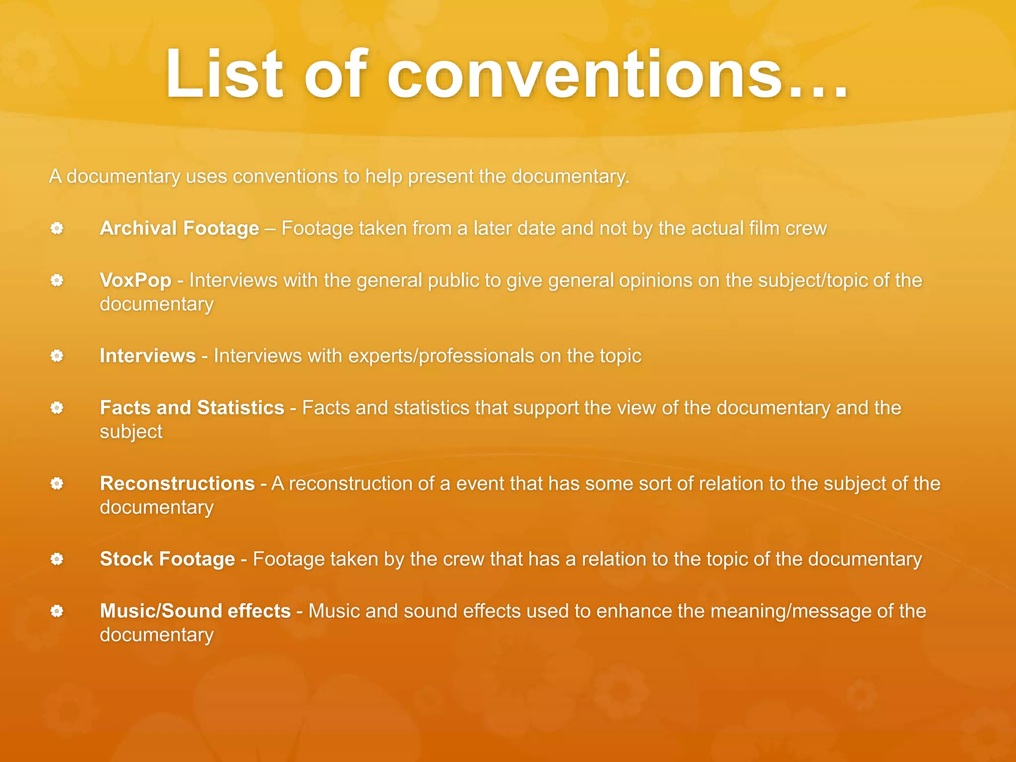 This document discusses conventions used in documentaries to present information, including archival footage, vox pops, interviews, facts and statistics, reconstructions, stock footage, and music. It also discusses how gatekeeping and construction of reality media theories relate to the use of these conventions in shaping the reality presented in documentaries.