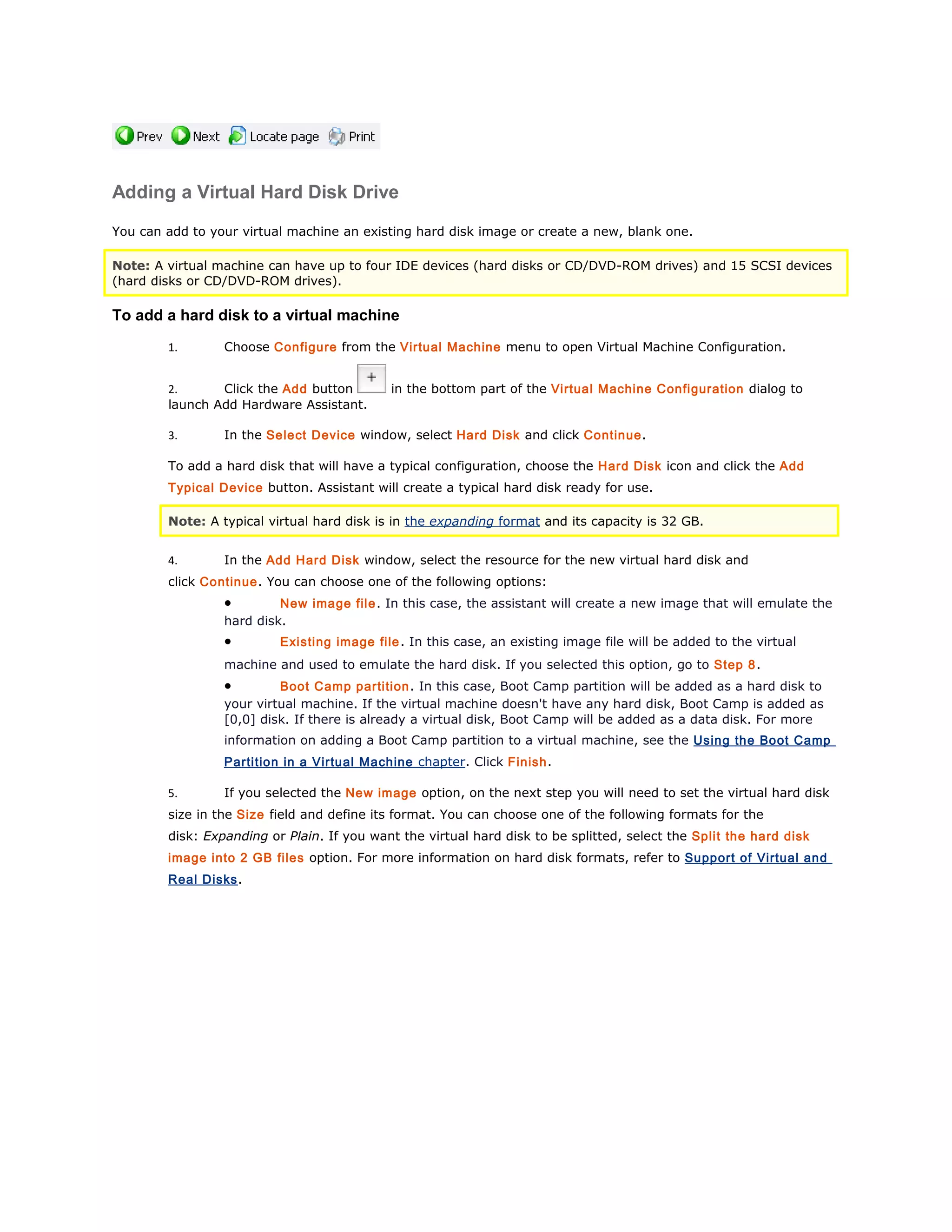 This document provides instructions for adding a virtual hard disk drive to a virtual machine. It explains that you can add an existing disk image or create a new blank disk. The steps are to open the virtual machine configuration, add hardware by selecting a hard disk, and then choose whether to use a new or existing disk image file. It also notes limitations on the number and types of disk drives allowed.