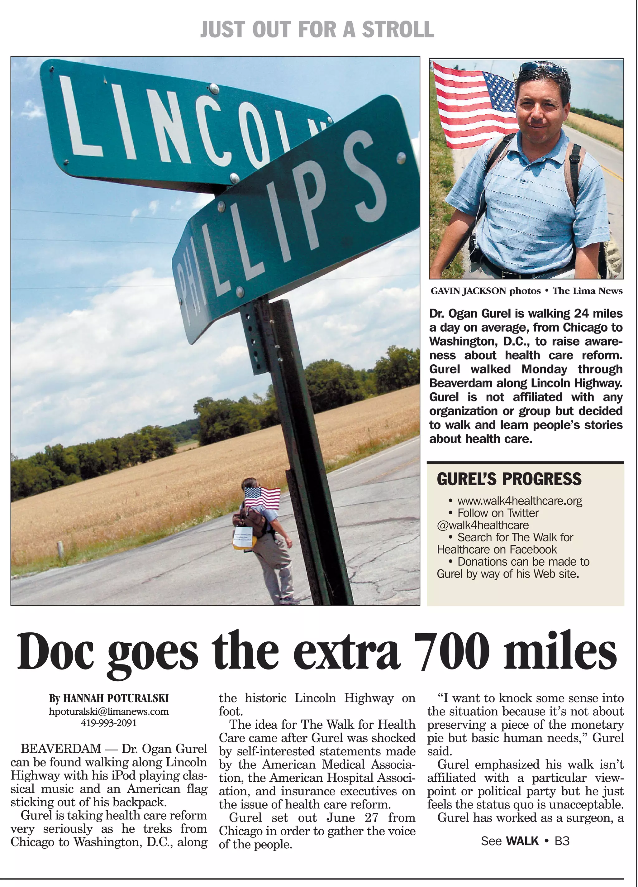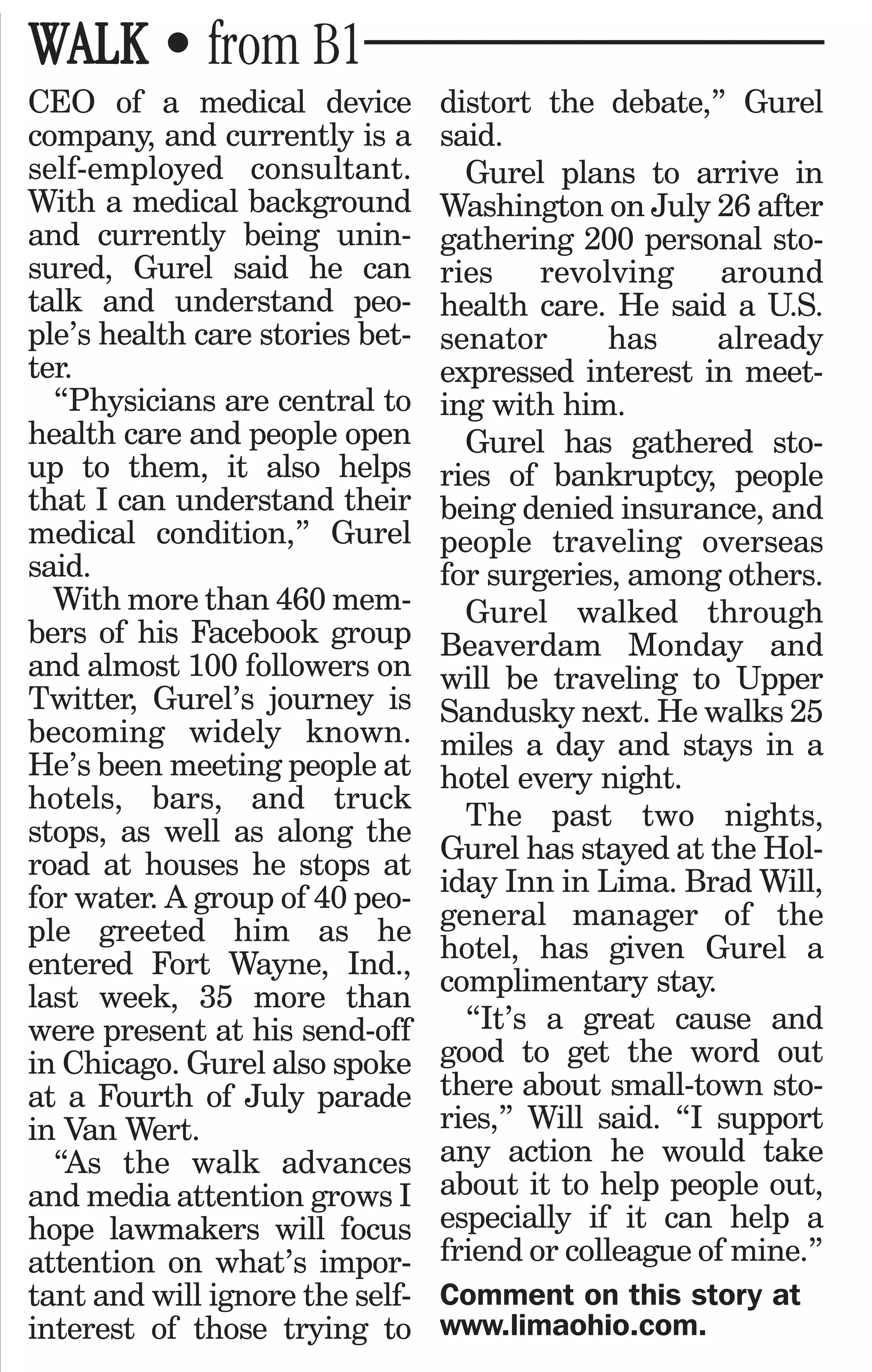 Dr. Ogan Gurel is walking from Chicago to Washington D.C., a distance of over 700 miles, to raise awareness about health care reform. He is collecting stories from people along the way about their experiences with health care. His goal is to advocate for reforming the system to better meet basic human needs. So far he has gathered many stories of bankruptcy, denied insurance, and people traveling overseas for medical care. He plans to present these stories to a U.S. Senator in Washington D.C. upon completing his journey on July 26th.