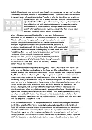 The document provides a summary of a student's process for creating an advertising campaign for Doc Martens boots. The student conducted research on advertising techniques, structures and styles. They also researched target audiences and created a storyboard. The student filmed footage in Manchester using models in Doc Martens boots. They edited the footage together but some indoor shots did not fit well. The finished ad focuses on the shoes and shows them being waterproof. The student reflects on improvements they could make, such as better planning and additional footage.