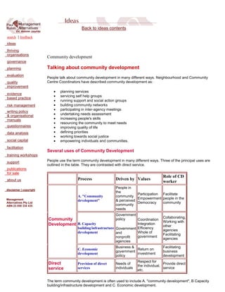 This document discusses different ways that community development is understood and defined. It is described as planning services, empowering communities, and working towards social justice by neighborhood coordinators. The document outlines three principal uses of the term: facilitating community participation and empowerment, building community capacity and infrastructure, and promoting economic development. Direct service focuses on meeting individual needs rather than community empowerment or collaboration.