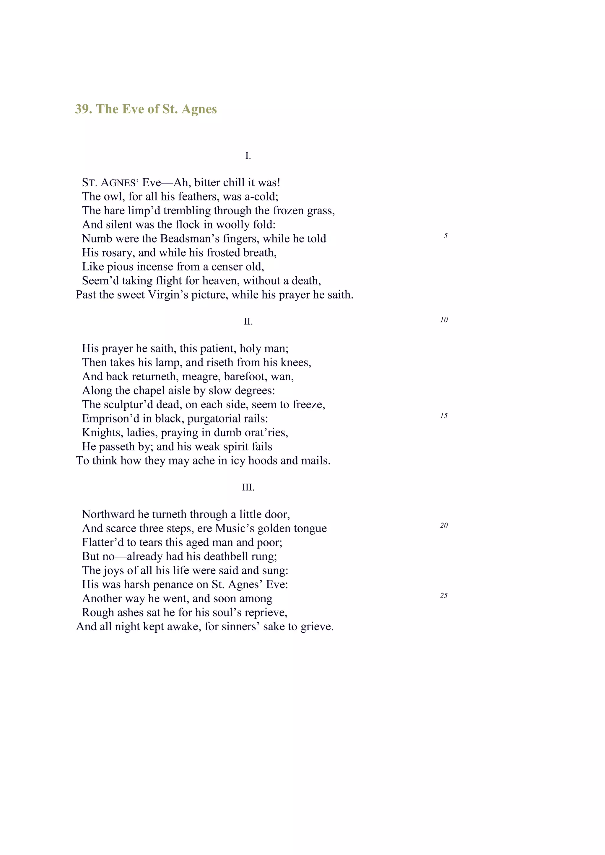 1) Porphyro sneaks into the mansion where his beloved Madeline is staying on St. Agnes' Eve, hoping to see her.