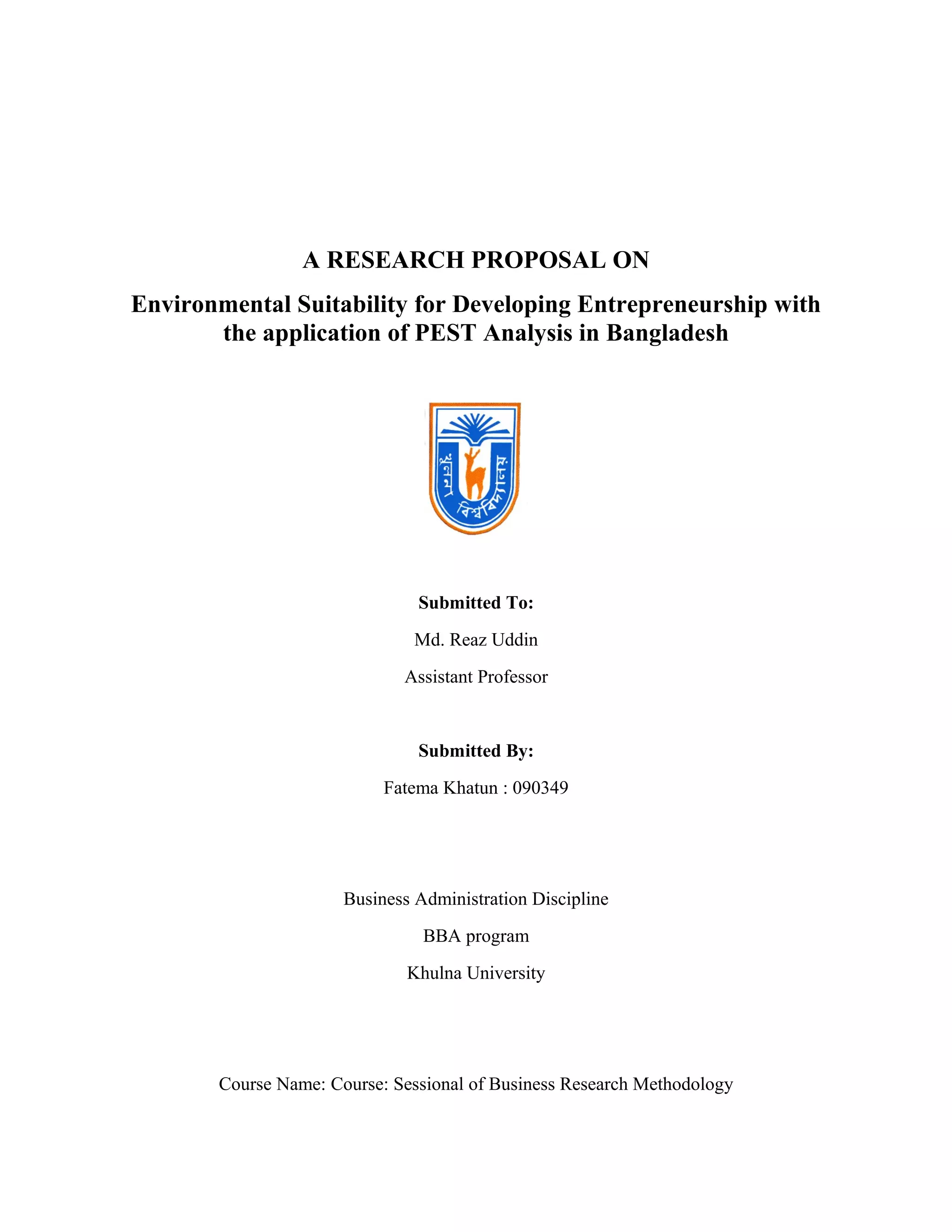This document discusses conducting a PEST analysis to evaluate the environmental suitability for developing entrepreneurship in Bangladesh. It provides background on entrepreneurship in Bangladesh historically and currently. It outlines the scope of the study, reviews relevant literature on factors influencing entrepreneurship development. This includes discussing economic and non-economic factors, the social and economic background of Bangladesh, conditions for women entrepreneurs, and problems associated with entrepreneurship development. The document proposes using PEST analysis to evaluate the political, economic, social, and technological environment in Bangladesh to identify opportunities and challenges for growing entrepreneurship.