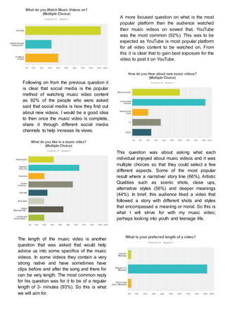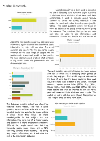 The document summarizes the results of a market research survey conducted to inform the creation of a music video. The survey was distributed through Survey Monkey and gathered demographic information about respondents' age, music preferences, and how often they watch music videos. Most respondents were 17-19 years old and enjoyed pop, indie, house, and rock music genres. Most watched music videos frequently on YouTube. Respondents indicated they look for narrative/storylines, artistic qualities, and deeper meanings in music videos. The survey provided useful insight into the target audience and informed decisions about the song, length, style, and distribution of the new music video.