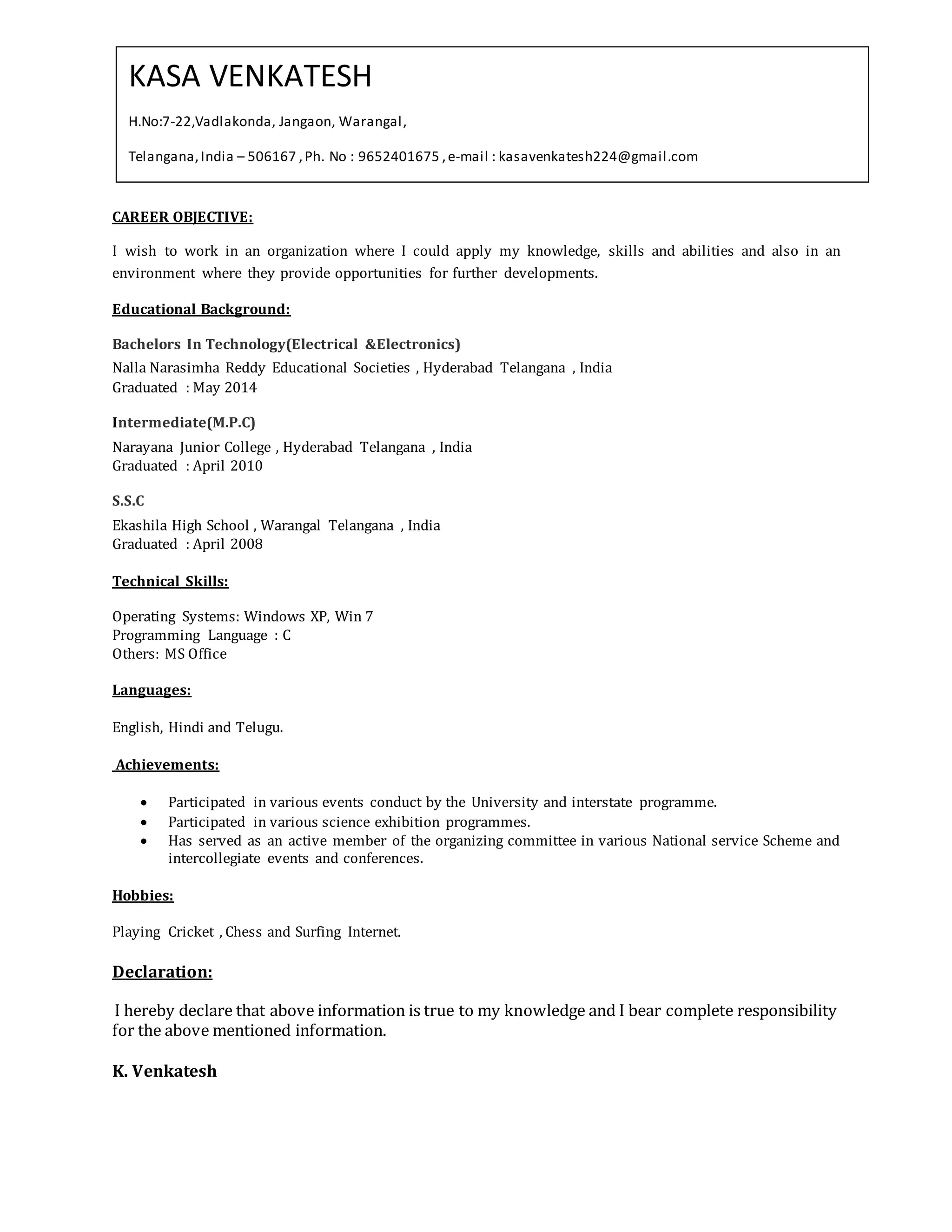 This document is a resume for K. Venkatesh summarizing his educational and professional background. He obtained a Bachelor's Degree in Technology with a focus on Electrical and Electronics from Nalla Narasimha Reddy Educational Societies in Hyderabad, India in 2014. His technical skills include Windows, C programming, and Microsoft Office. He is proficient in English, Hindi, and Telugu and enjoys playing cricket, chess and surfing the internet in his free time.