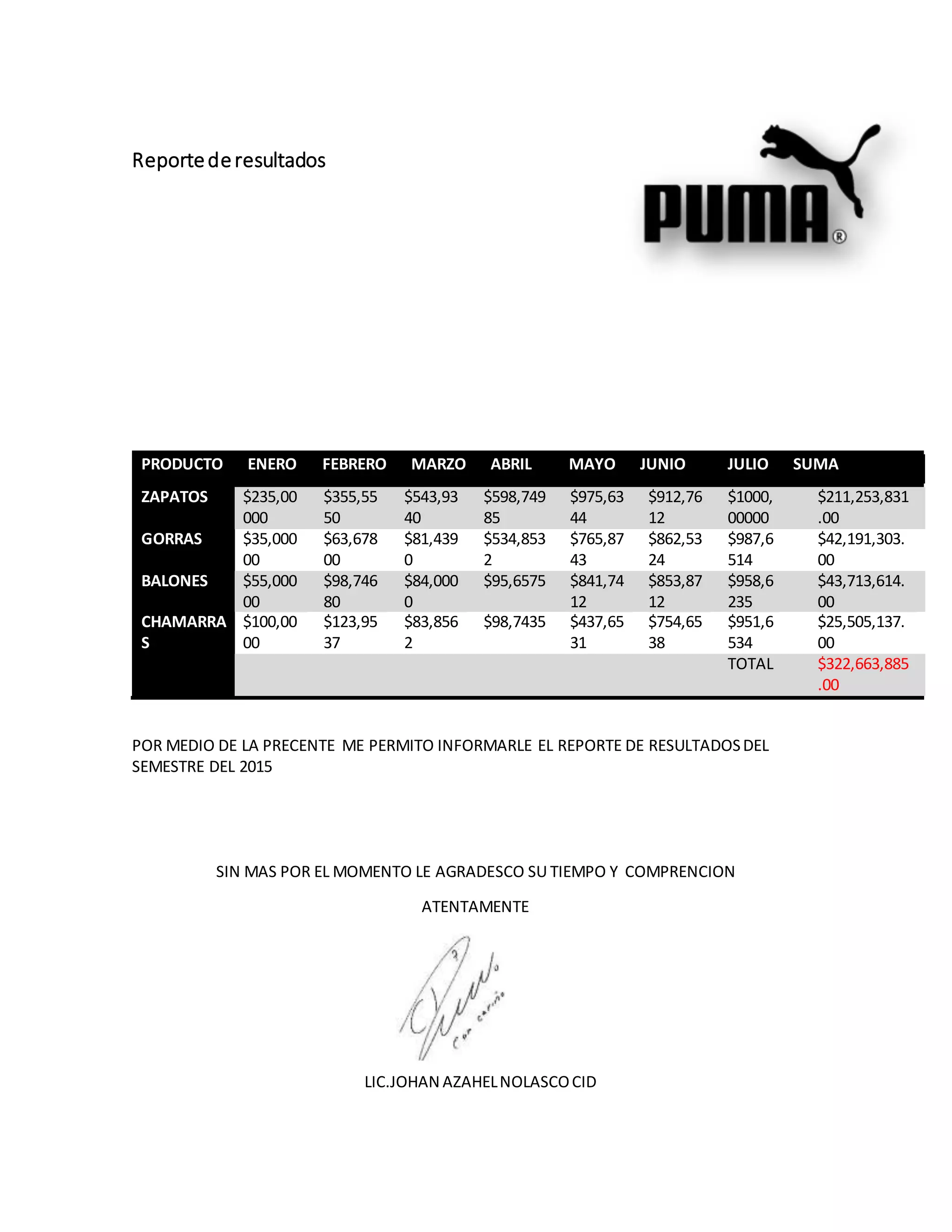 The document reports the sales results for various products over the first half of 2015. It shows the monthly sales figures from January to June for shoes, hats, balls, and jackets. The total sales across all products for the six month period was over $322 million.