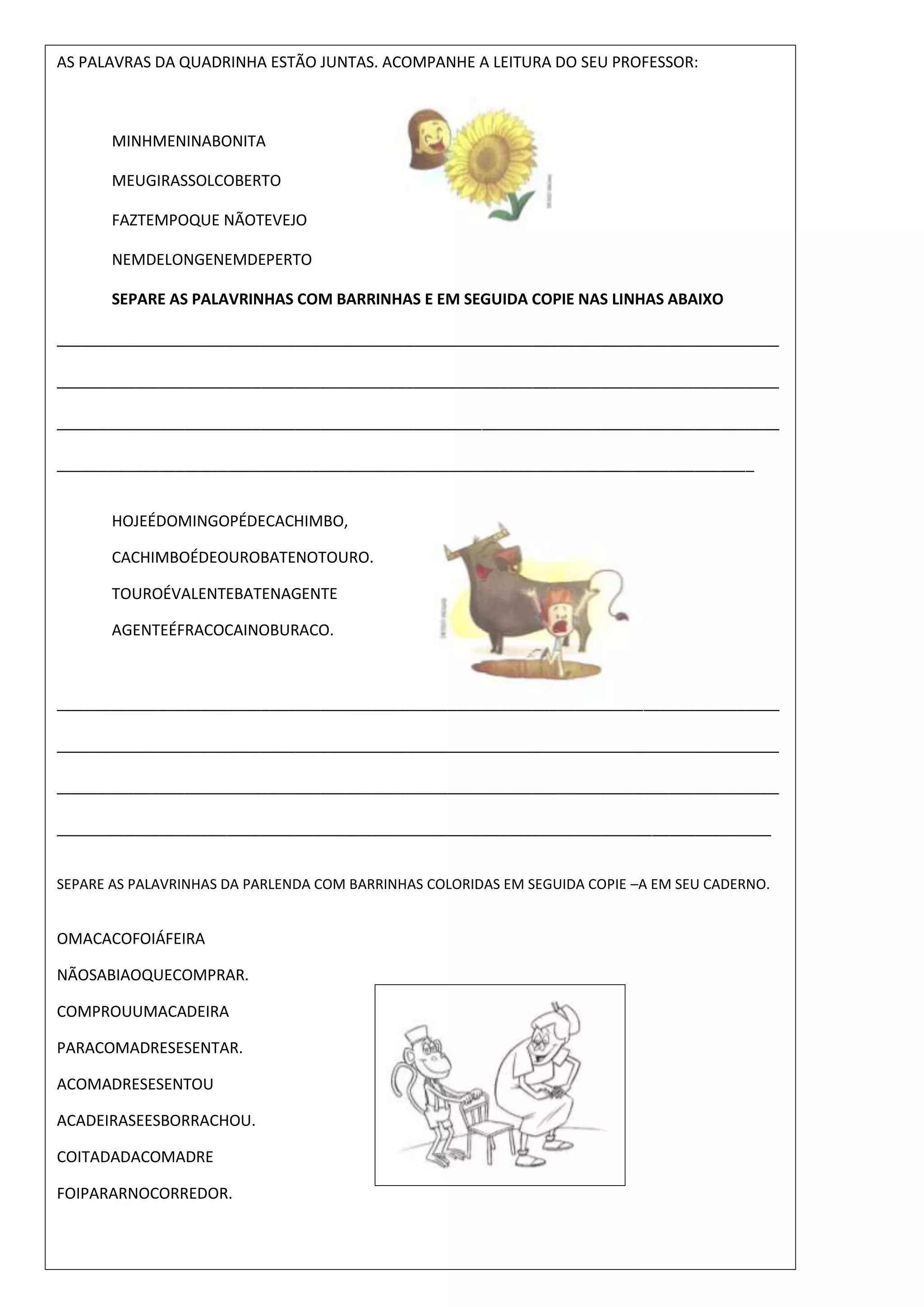 The document instructs students to separate words in passages into individual words by inserting lines between the words, then copying the separated words into their notebooks. It provides two passages for the students to separate and copy, with the second passage being a rhyming children's story. The document encourages following the teacher's reading and instructions for the activity.