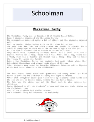 The document summarizes various events that took place at Kehtna Basic School. It describes a career fair called Young Master that introduced vocational occupations to students. It also discusses the election of the Student Council, a Christmas party put on by Form 8 students where animals auditioned to be the new Santa, an Estonian trivia competition, a singing contest for Estonian Week, and an interview with the PE teacher. Other events mentioned include the school's 170th anniversary celebration and a visit from partner schools for the Comenius project on water.