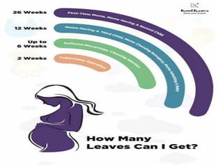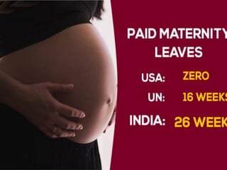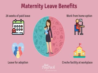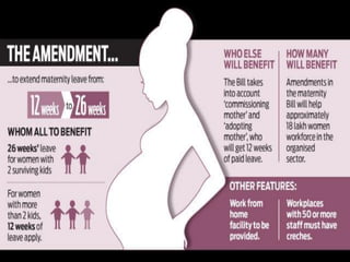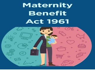 The document discusses India's Maternity Benefit Act of 1961, which was passed to protect the dignity of motherhood by providing health protections and leave for women employees during pregnancy and after childbirth. The key provisions include: