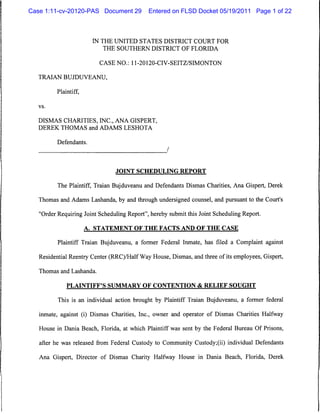 This joint scheduling report summarizes a civil case between plaintiff Traian Bujduveanu and defendants Dismas Charities Inc., Ana Gispert, Derek Thomas, and Adams Lashota. Bujduveanu, a former federal inmate, alleges violations of his constitutional rights and other claims related to his imprisonment at Dismas Charities halfway house. The defendants contend that Bujduveanu violated the conditions of his home detention and was terminated from the halfway house program. A motion to dismiss filed by the defendants is pending. The parties disagree on the length of the trial and likelihood of settlement. They outline proposed discovery deadlines and trial dates in an attached schedule.