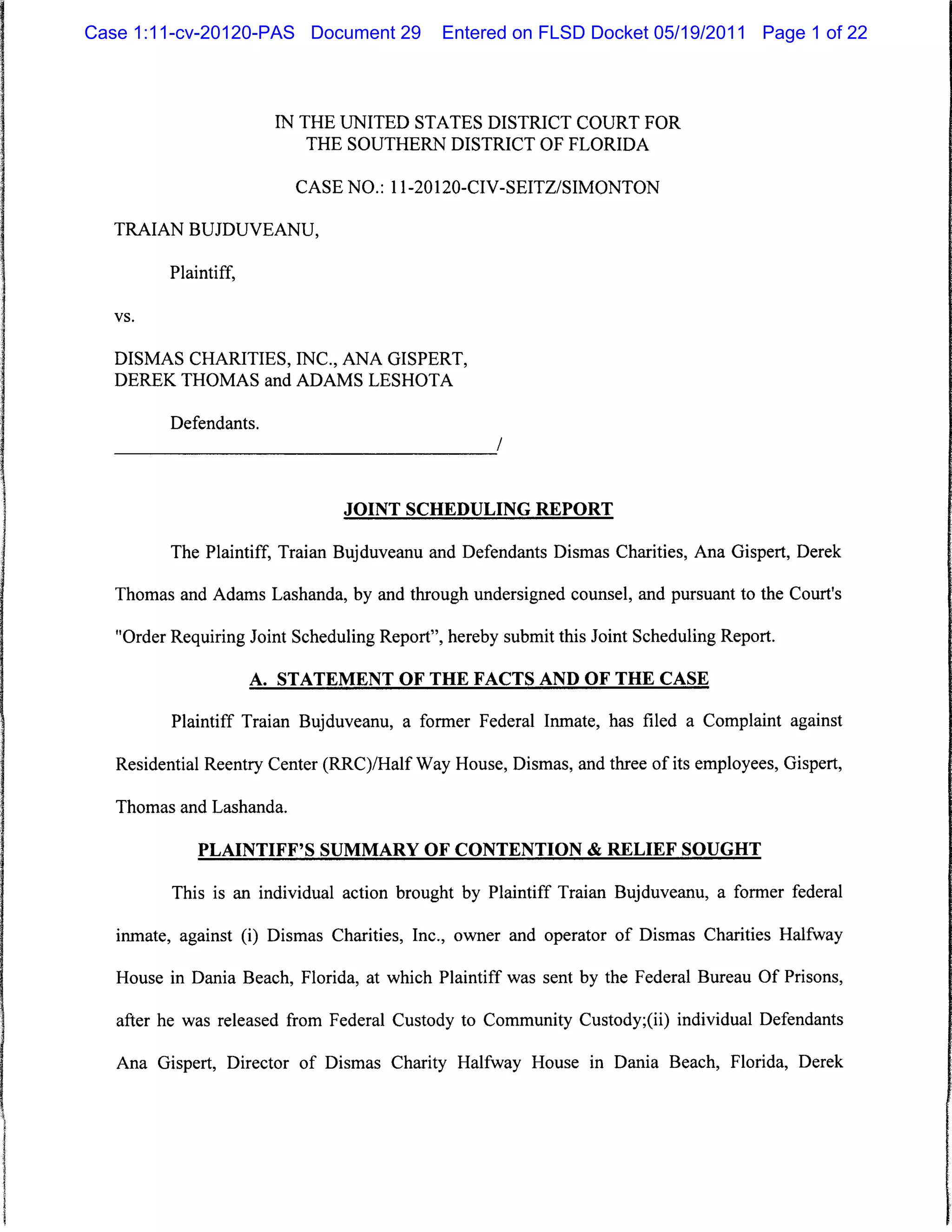 This document is a joint scheduling report submitted to a federal court in the Southern District of Florida for Case No. 11-20120-CIV-SEITZ/SIMONTON. It provides summaries of the plaintiff and defendants' positions. The plaintiff, a former federal inmate, alleges civil rights violations against a halfway house and its employees. He claims they unlawfully searched, arrested, and imprisoned him. The defendants contend the plaintiff violated the conditions of his home detention and was terminated from the halfway house program. No defenses have been asserted yet, as the defendants filed a motion to dismiss the plaintiff's complaint.