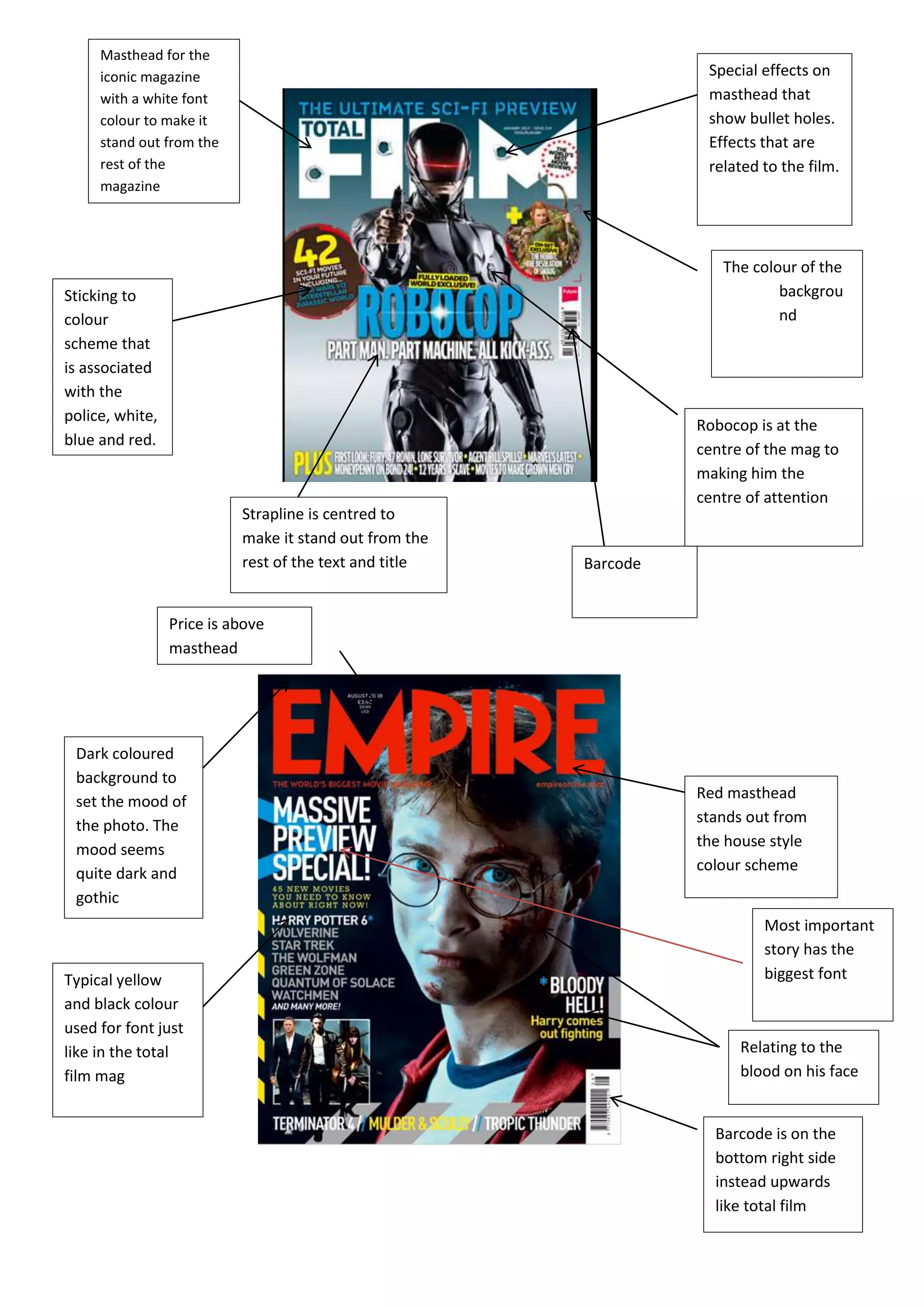 The magazine cover features Robocop prominently in the masthead against a dark background, with bullet holes and blood on his face relating to the film. The masthead uses a colour scheme associated with police like white, blue and red. Key information like the title, strapline and price are emphasized with font size and centering to stand out from the rest of the text on the cover.