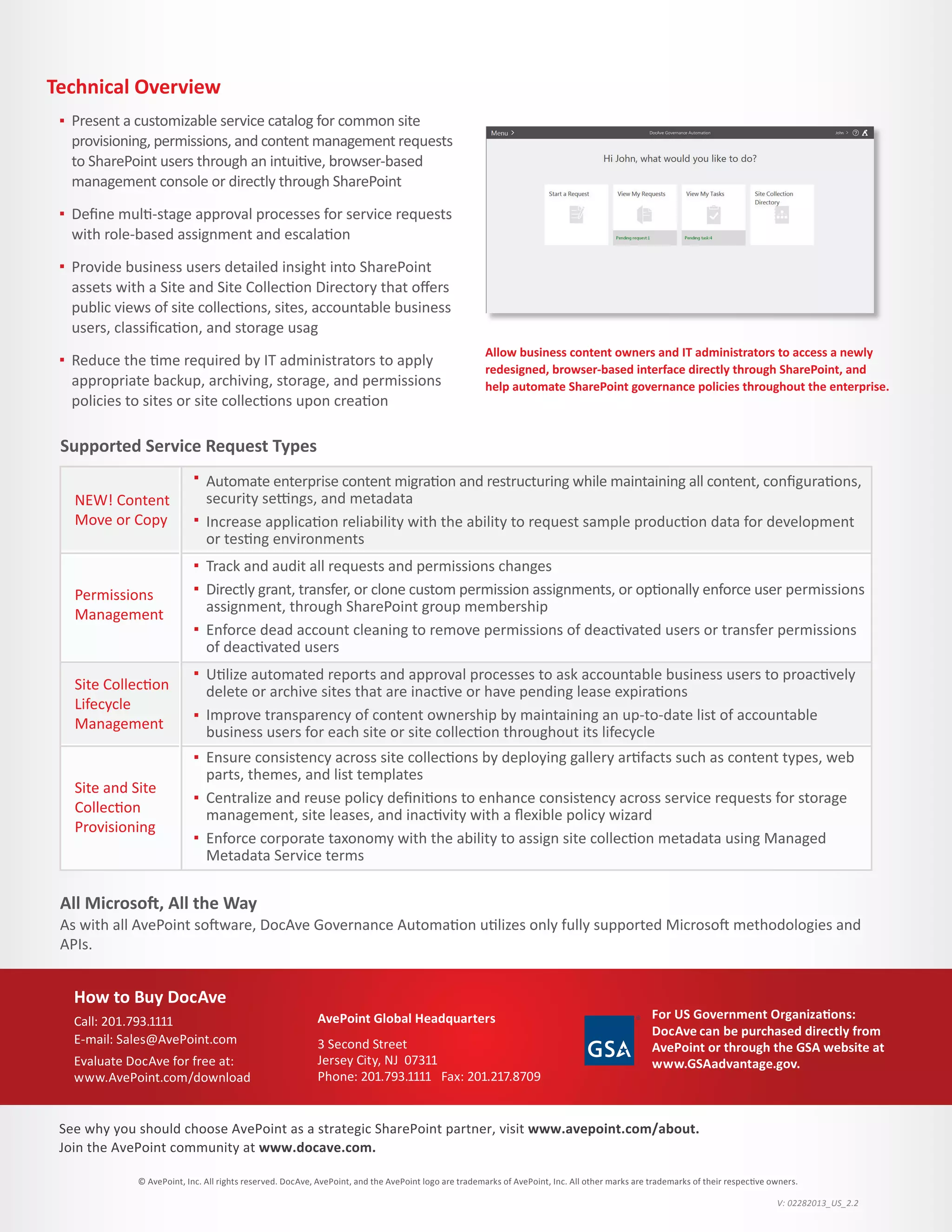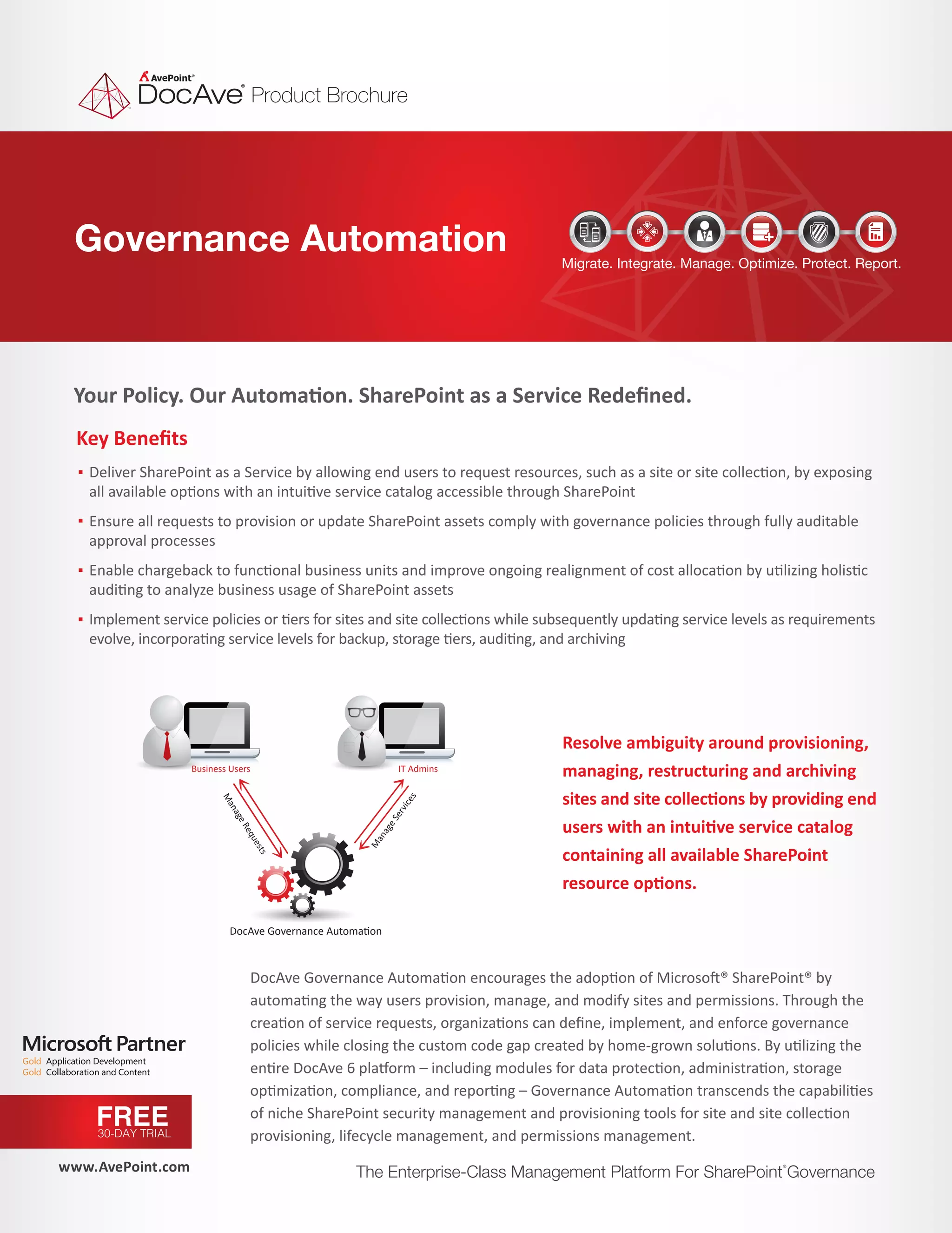Resolve ambiguity around provisioning, managing, restructuring and archiving sites and site collections by providing end users with an intuitive service catalog containing all available SharePoint resource options. Allow business content owners and IT administrators to access a newly redesigned, browser-based interface directly through SharePoint, and help automate SharePoint governance policies throughout the enterprise. Supported service requests include permissions management, site collection lifecycle management, site and site collection provisioning, and content migration and restructuring.