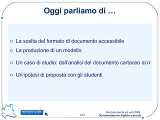 Il documento discute l'importanza della scelta di formati accessibili per la documentazione digitale a scuola, analizzando vari formati come PDF e TXT e le loro caratteristiche di accessibilità. Viene presentata una guida su come creare PDF accessibili partendo da documenti Word e l'importanza di utilizzare modelli per facilitare il lavoro. Infine, il documento propone un progetto per coinvolgere gli studenti nella scrittura accessibile attraverso varie fasi di apprendimento e correzione del linguaggio.