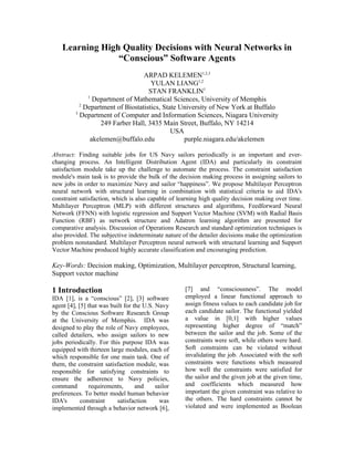 The document proposes using neural networks to help an intelligent software agent called IDA learn to make high-quality decisions for assigning US Navy sailors to new jobs. Specifically, it evaluates using feedforward neural networks, multilayer perceptrons, and support vector machines to model the decision-making of human Navy personnel called detailers. The neural networks are trained on data from detailers involving sailors, jobs, and which jobs were offered to learn the constraints and preferences that guide human decisions. The goal is for the neural networks to help IDA's constraint satisfaction module make more human-like decisions over time as situations change.