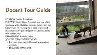 The Living Free sanctuary gives tours to educate visitors about rescuing pets and helping veterans. Volunteer docents are needed to drive visitors around the property in Living Free vehicles, giving 50-minute tours three times a week. Docents must have a driver's license and excellent communication skills to explain the sanctuary's mission, history of rescuing animals, and equine program for veterans over the tour route. Training is provided on giving the scripted tour, driving, and radio use.