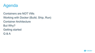 Containers are not virtual machines - they have fundamentally different architectures and benefits. Docker allows users to build, ship, and run applications inside containers. It provides tools and a platform to manage the lifecycle of containerized applications, from development to production. Containers use layers and copy-on-write to provide efficient application isolation and delivery.