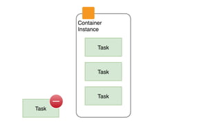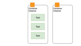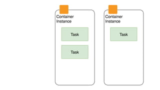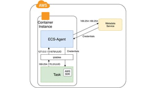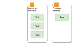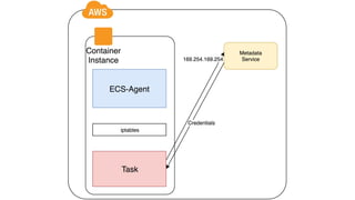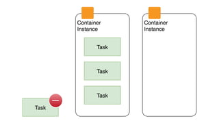 The document outlines the process of continuously delivering Docker containers on AWS using ECS, highlighting deployment options, task definitions, and service descriptions. It discusses scaling strategies for both clusters and services, and emphasizes security practices such as IAM roles and restricting EC2 access. The document also includes detailed CloudFormation templates for configuration and automation of services in AWS.