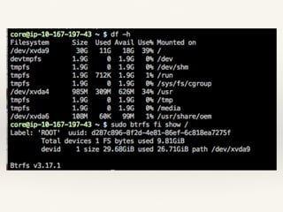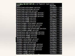 The document discusses Docker and CoreOS for deploying applications to production. It provides an overview of Docker, CoreOS, Etcd for service discovery, Fleet for cluster management, and using Systemd and Docker together. Examples are given for setting up databases, logging, and deploying Presence and Ambassador microservices. Issues addressed include killing Docker containers, disk space on Btrfs, and image sizes. Other orchestration tools like Kubernetes and Deis are also mentioned.