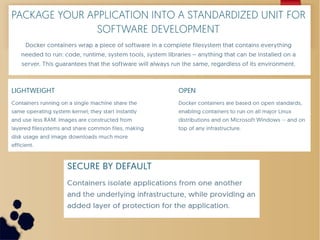 Docker is a tool that allows developers to package applications and dependencies into containers that can be run anywhere. The document discusses how Docker eliminates complexity by allowing developers to build, ship and run distributed applications using containers. It provides instructions on how to install Docker and create a simple "hello world" Docker container to demonstrate its basic functionality.