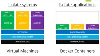 This document provides an overview of Docker for developers. It discusses Docker's capabilities for solving portability issues, its advantages over traditional virtualization through operating system-level virtualization using containers that share the same kernel, and how it addresses challenges like slow development times and inefficient resource usage. It also covers Docker concepts like images, containers, registries, networking, security best practices using tools like Docker Bench Security, and cluster management using Docker Swarm.