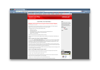 The document discusses the architectural differences between virtual machines (VMs) and Docker containers, emphasizing that Docker containers are lightweight, isolated environments that share operating system resources, leading to faster deployment and lower overhead. It outlines the advantages of Docker, including portability, scalability, and cost-efficiency, as well as providing an overview of Docker images and commands. Additionally, it highlights Docker's suitability for creating independent application building blocks and its growing support in software delivery, particularly for Oracle applications.