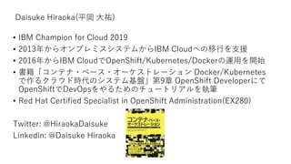 IBM Champion for Cloud 2019 • 2013年からオンプレミスシステムからIBM Cloudへの移行を支援 • 2016年からIBM CloudでOpenShift/Kubernetes/Dockerの運用を開始 • 書籍「コンテナ・ベース・オーケストレーション Docker/Kubernetes で作るクラウド時代のシステム基盤」第9章 OpenShift Developerにて OpenShiftでDevOpsをやるためのチュートリアルを執筆 • Red Hat Certified Specialist in OpenShift Administration(EX280) Twitter: @HiraokaDaisuke Linkedin: @Daisuke Hiraoka