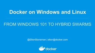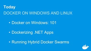 The document discusses Docker on Windows and Linux in three parts. Part 1 provides an introduction to Docker on Windows, covering the Docker platform, Windows containers, and building, shipping, and running containers. Part 2 discusses dockerizing .NET applications, including modernizing traditional apps, breaking up monoliths, and deploying with Docker Compose. Part 3 explains how to run a hybrid Docker swarm, deploying services to Windows nodes and moving services to Linux nodes.
