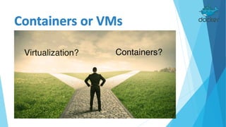 Docker is an open platform for building, shipping and running distributed applications. It allows developers to package applications into containers that have everything needed to run, including libraries and other dependencies, and ship them to any Docker-enabled infrastructure. Containers are more portable and provide better isolation than virtual machines, and allow applications to be deployed with minimal overhead or conflict. Docker uses containers, images and a Dockerfile to deploy and run applications reliably across any infrastructure.