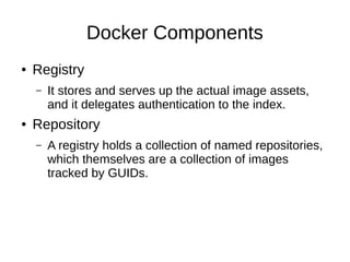 This document introduces Docker, a lightweight container virtualization platform. It discusses how Docker uses Linux kernel features like namespaces and control groups to provide isolation similar to virtual machines but with less overhead. Docker images act as templates to launch containers which contain all dependencies for running applications. The document demonstrates how to install Docker, run containers from images, and manage images and containers. It explains key Docker components like images, containers, registries and repositories. Finally, it encourages getting involved in open source Docker projects.