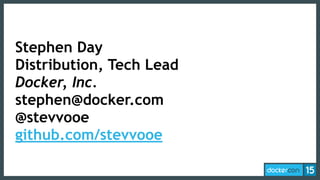 This document discusses Docker Registry API V2, a new model for image distribution that addresses limitations in the previous V1 API. Key changes include making layers content-addressable using cryptographic digests for identification and verification. Images are now described by manifests containing layer digests. The registry stores content in repositories and no longer exposes internal image details. Early adoption shows V2 providing significantly better performance than V1 with 80% fewer requests and 60% less bandwidth used. Future goals include improving documentation, adding features like pull-through caching, and developing the Docker distribution components to provide a foundation for more advanced distribution models.