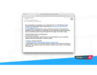 Securing software supply chains and deployed systems is important. The document discusses using Docker Content Trust (DCT) to ensure authenticity, integrity, and freshness of container images. It also recommends validating dependencies, signing applications, scanning for vulnerabilities, and using features in Docker 1.12 like mutual TLS and certificate rotation to securely manage Docker clusters.