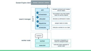This document discusses Microservices and Docker Swarm. It begins by introducing the presenter and their background. It then defines what a microservice is and introduces Docker. Key concepts about Docker Swarm are explained such as swarm features, service discovery without an external database, and the swarm concept of managers, workers, services and tasks. It demonstrates how to build a swarm cluster and add nodes, and discusses security, routing mesh, scaling, reverse proxy, rolling updates and secrets. Finally it briefly mentions logging, metrics and dashboard tools to monitor Docker systems.