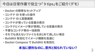• dockersystem prune (中間イメージ、キャッシュ、未使用ネットワークも)